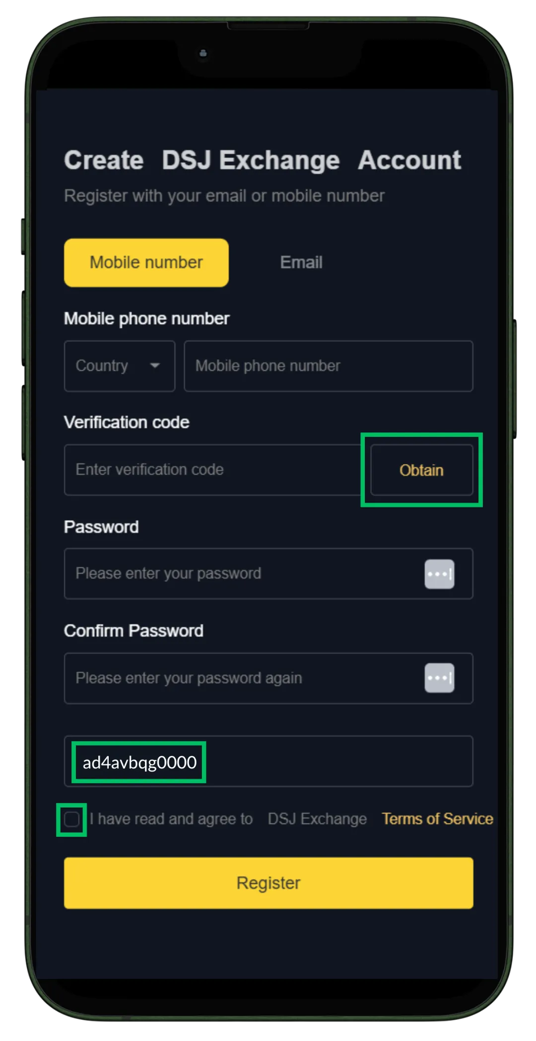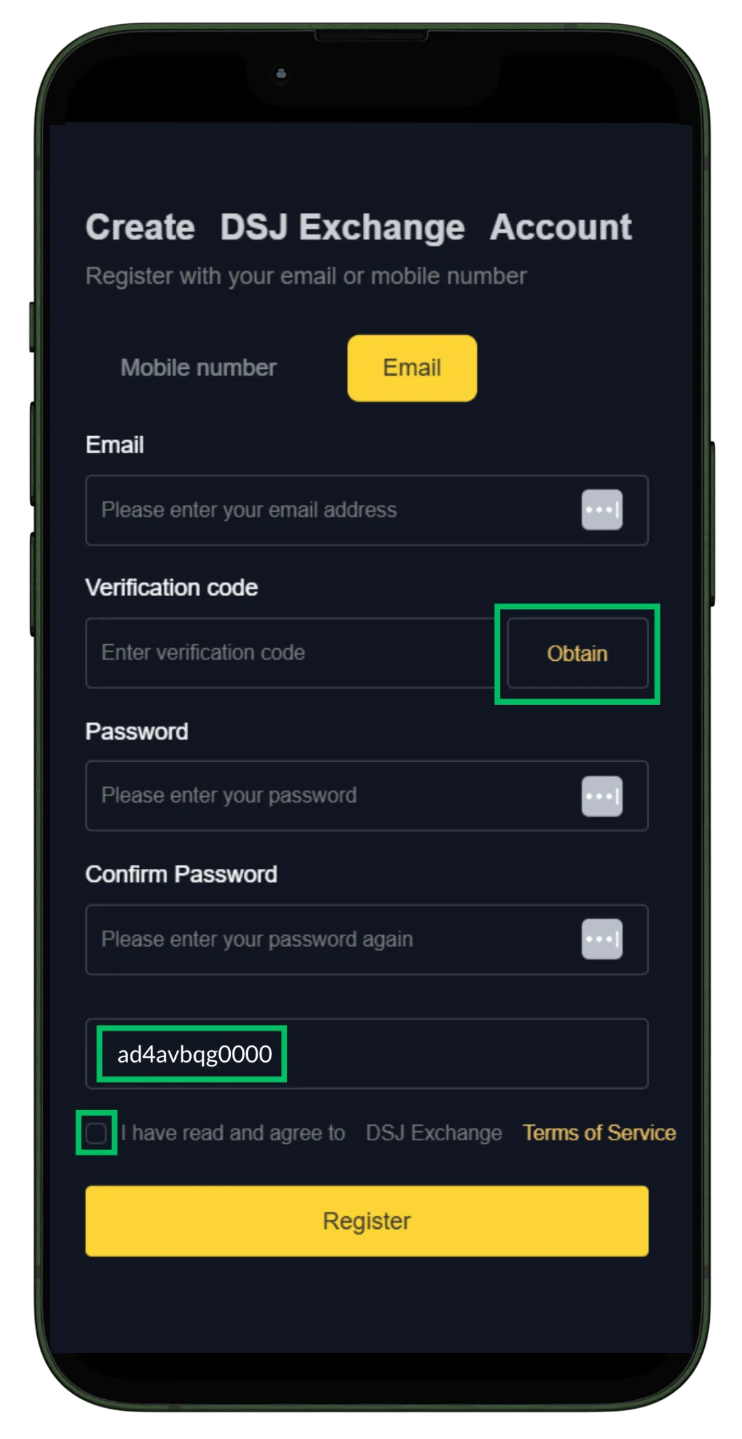 Click "Obtain" then enter the Captcha code and click "Confirm" to receive your verification code (sent to your mobile phone or email)